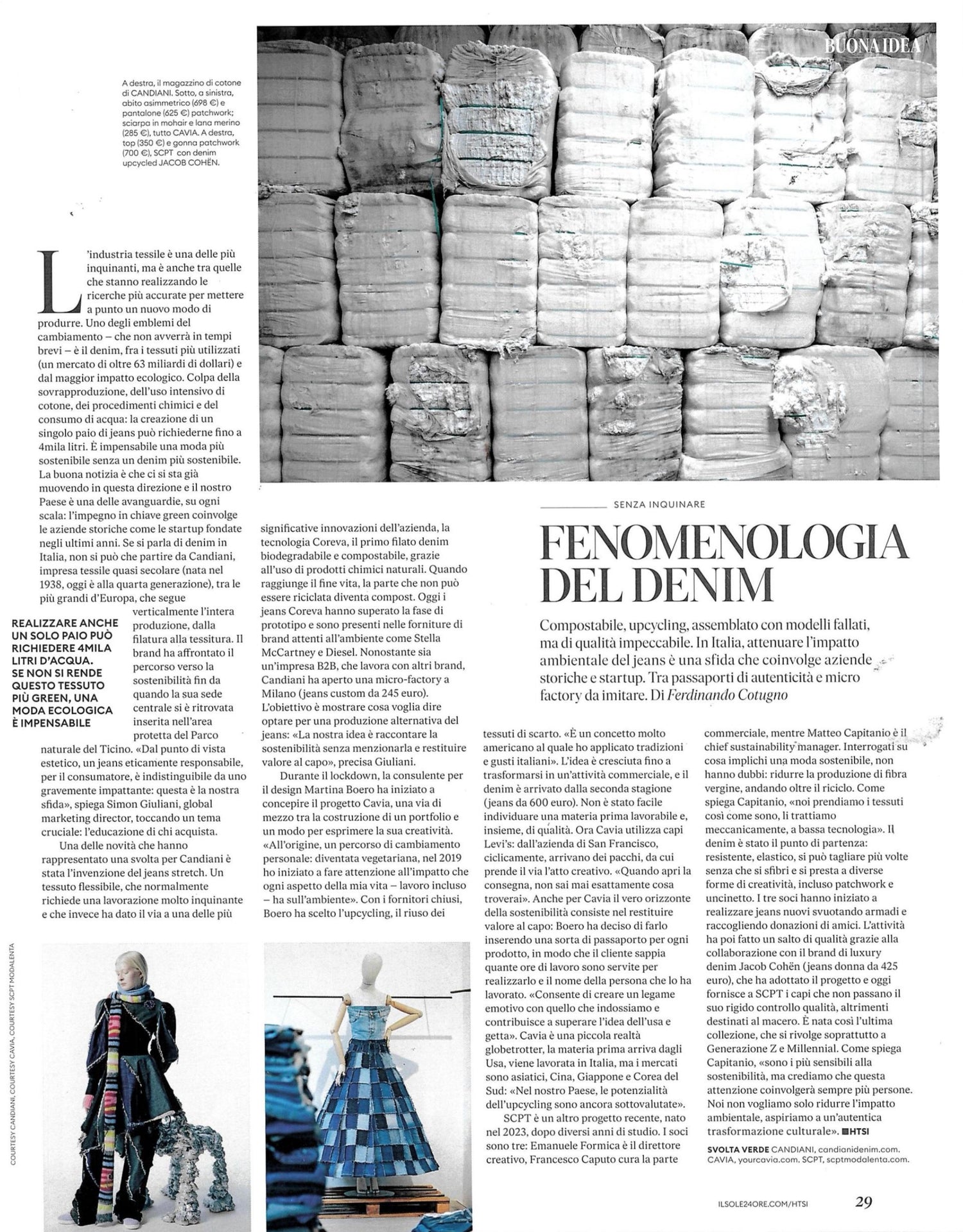 “Per comprendere come lavorano basta riprendere ciò che hanno fatto in collaborazione con il brand di luxury denim Jacob Cohën, che ha dato loro jeans che non passavano il controllo qualità e che, quindi, erano destinati al macero. SCPT ha «sventrato» i 1.416 modelli e li ha divisi per composizione; tagliandoli in modo da evitare scarti, ne ha fatti rettangoli da lavorare a patchwork e assemblarli in nuovi capi. Così l'essenza del nome del marchio prende forma”